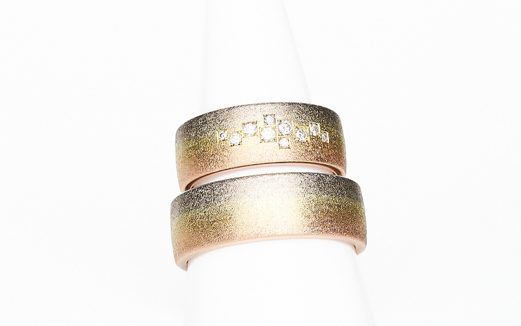 Diese außergewöhnlichen Partnerringe vereinen gleich sechs edle Goldtöne zu einem harmonischen Farbspiel: 585er Gelbgold, Rotgold, Roségold, Weißgold, Grüngold und Graugold fließen sanft ineinander und erinnern an die schimmernden Nuancen eines Regenbogens. Jedes Stück ist ein handgefertigtes Unikat – absolut individuell und unverwechselbar.