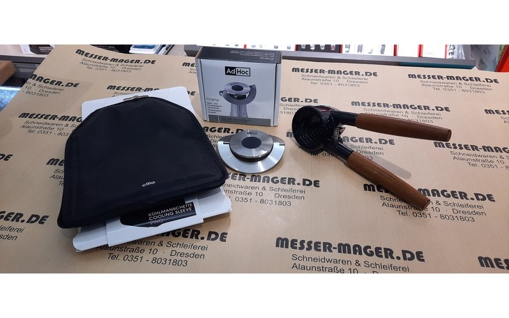 Set bestehend aus Kühlmanschette, Sektverschluss und Sektzange