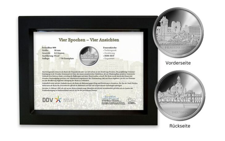 Sichern Sie sich die vier Sonderprägungen "Dresdner Frauenkirche in 4 Epochen" in Feinsilber. Das Set besteht aus folgenden Einzelprägungen: