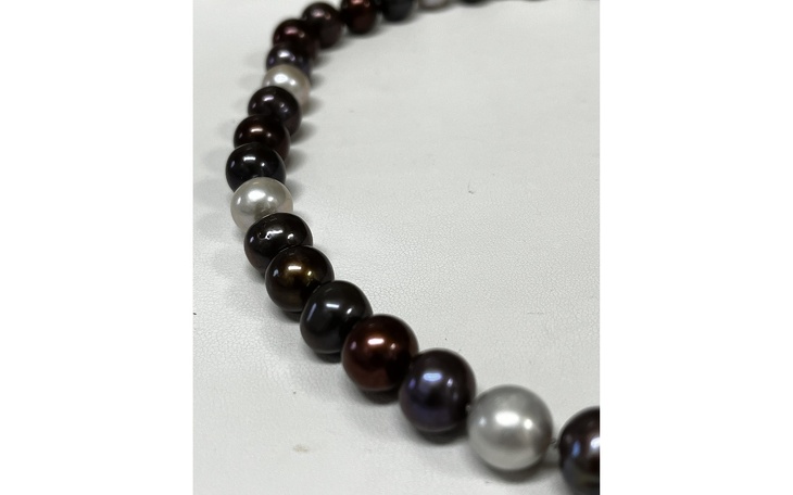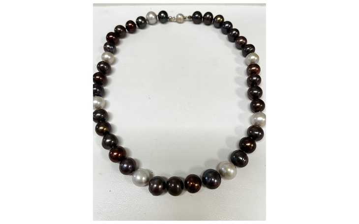 Wunderschöne mehrfarbige Perlenkette mit Perlen in der Größe 11-12mm. Die Perlen haben viele verschiedene Farben, von weiss, grau, bläulich bis zu schwarz.
