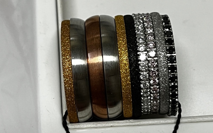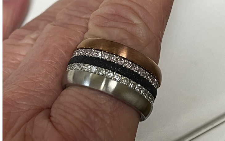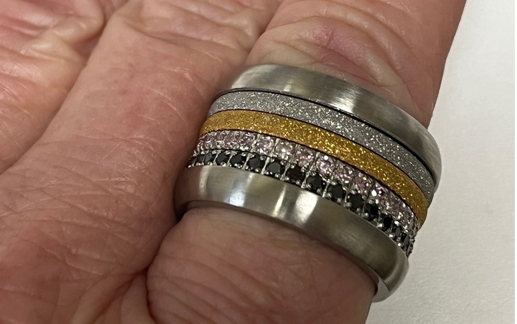cooler Ring aus Edelstahl mit 10 einzelnen Ring die unterschiedlich in der Breite und Frabe kombiniert werden können.