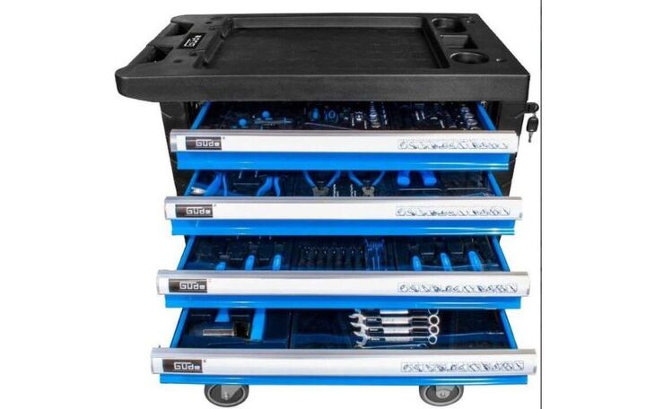 Der GÜDE Werkstattwagen »Premium GWP 07« ist die ideale Lösung für Ihre Werkstatt. Mit seinen 7 kugelgelagerten Schubladen bietet er reichlich Stauraum für Ihr Werkzeug. Die doppelte Wandkonstruktion sorgt für zusätzliche Stabilität, während Stoßschutz-Ecken den Wagen vor Beschädigungen schützen. Der Werkstattwagen verfügt über eine Zentralverriegelung mit Haupt- und Ersatzschlüssel, um Ihr Werkzeug sicher zu verwahren. Das umfangreiche 250-teilige Werkzeugset umfasst alles, was Sie für verschiedenste Aufgaben benötigen – von Steckschlüsseleinsätzen und Schraubendrehern bis hin zu Zangen und Gabelringschlüsseln. Dank der praktischen Rollen lässt sich der Wagen einfach transportieren und flexibel in Ihrer Werkstatt einsetzen. Mit einer Größe von 683 mm Breite und 980 mm Höhe ist der GÜDE Werkstattwagen nicht nur funktional, sondern auch platzsparend. Setzen Sie auf Qualität und Zuverlässigkeit mit dem GÜDE Werkstattwagen »Premium GWP 07«.