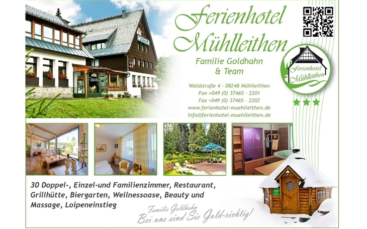 Im Ferienhotel Mühlleithen im Naturpark Erzgebirge/Vogtland sind Sie GOLD-richtig! Das Hotel bezaubert im Winter mit herrlichem Weihnachtsambiente mit Raachermanneln & Co und draußen der tief verschneite Winterwald. Kuschelig & gemütlich in der hauseigenen Wellnessoase mit 3 Saunen und Whirlpool entspannen und ein leckeres Menü im eigenen Restaurant "Vugelbeerbaam" genießen.