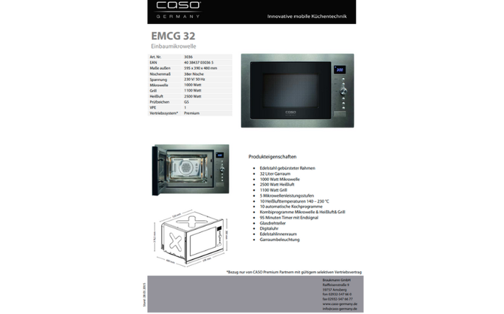 Wir bieten Ihnen auf diesem Wege im Zuge des Muster-Abverkaufs („gekauft wie gesehen“) eine Einbau-Mikrowelle „CASO EMCG32“ mit integrierter Heißluft- und Grillfunktion in der Originalverpackung.