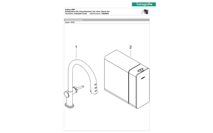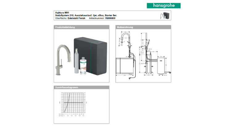 Wir bieten Ihnen auf diesem Wege im Zuge des Muster-Abverkaufs („gekauft wie gesehen“) ein „SodaSystem 210 Aquittura M91 mit Ausziehauslauf 1j sBox Starter Set“ von Hans Grohe in Edelstahl (Art.76806800, Zustand: original verpackt).