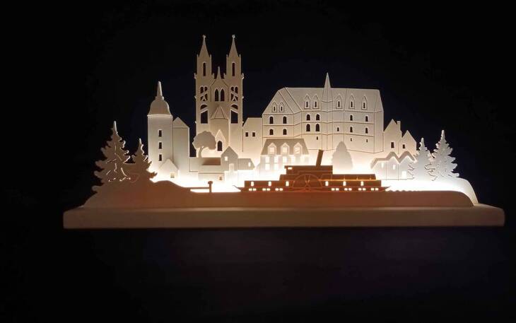 Meißen hat von Natur aus eine wunderbare Silhouette. Man erkennt die am Ufer stehenden Häuser. Dierekt dahinter liegt auf dem Burgberg das einmalige Ensemble von Albrechtsburg, Dom und ehemaligem Bischofsschloss. Im Vordergrund schippert der Meißner Dampfer.