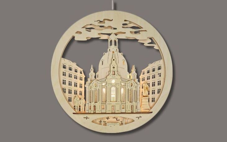 Wunderschönes Fensterbild mit dem Motiv der Frauenkirche Dresden. Das Fensterbild hat einen Durchmesser von 32cm und ist innen mit einem LED-Stripe beleuchtet.