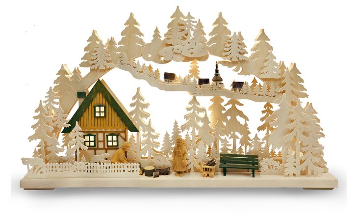 Der Schwibbogen Altseiffener Handwerk zeigt in der Ferne das Dorf Seiffen mit seiner charakteristischen Kirche. Zwei geschnitzte Massivholzfiguren bilden den zentralen Blickfang dieses typisch erzgebirgischen Schwibbogens. Mit einer Handkarre voller Holz arbeiten sie vor einem farbig gebeizten Haus. Eine Bank lädt zum Verweilen inmitten eines filigran aus Birkenholz gesägten Waldes ein. Die naturbelassenen Bäume bilden einen schönen Kontrast zu den farbigen Dächern des kleinen Dörfchens. Die blendfrei verbaute Beleuchtung sorgt für eine behagliche Atmosphäre und zieht den Betrachter in seinen Bann.