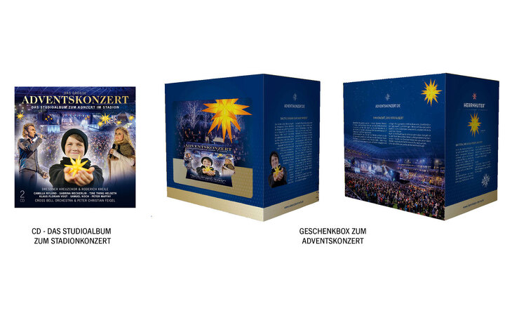 Die Geschenkbox enthält die Doppel-CD zum Stadionkonzert sowie einen ca. 13 cm kleinen, gelben Herrnhuter Stern aus Kunststoff, vormontiert inklusive Beleuchtungsset und passendem Batteriehalter in einer hochwertigen Weihnachtsverpackung inklusive Schuber.