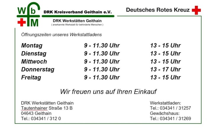 Wir: die DRK Werkstätten Geithain - sind Werkstätten für behinderte Menschen – WfbM. Wir ermöglichen diesen Menschen eine berufliche Rehabilitation und Teilhabe am Arbeitsleben. Wir arbeiten in 17 verschiedenen Abteilungen u.a. Holz- und Metallbearbeitung, Töpferei, Büroservice, Verpackung, Elektromontage, Gartenbau und Landschaftspflege, Komplettierung. In Geithain werden insgesamt 250 Menschen mit Behinderung betreut und gefördert. Zu unseren "Tagen der offenen Tür": immer am Samstag vor dem 1. Advent und vor dem Osterwochenende jeweils von 13 – 17 Uhr, eröffnen wir Einblicke in unsere Werkstätten und bieten den Besuchern die Möglichkeit, selbst kreativ zu werden und einen geselligen Nachmittag zu verbringen.