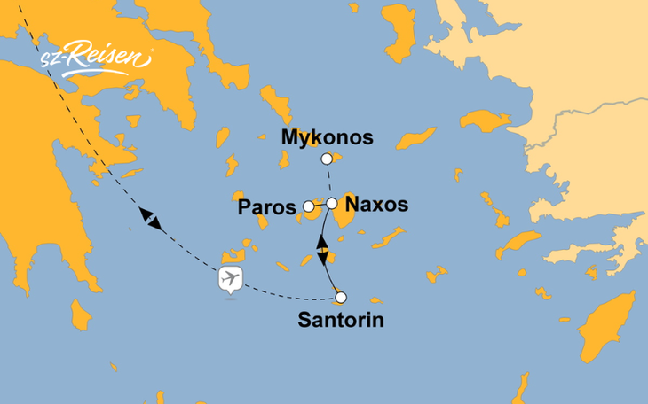 Santorin, Paros und Naxos sind antike Paradiese mit jeweils ganz eigenem Charme. Für Sie ist das Inselhopping auf den drei Schönheiten der Kykladen jetzt dank unseres Direktfluges nur einen weiteren „Hüpfer“ von Ihrem Abflugort entfernt.