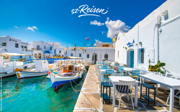 Von der Antike in die venezianische Epoche führt Ihr Weg auf Naxos. Hoch über dem Hafen zeugt das venezianische Kastell von den Blütezeiten des Seehandels. Bekannt war Naxos schon damals für sein Olivenöl und die Liköre aus Blättern des Zitrusbaumes, die Sie hier natürlich verkosten werden. Überhaupt ist diese Reise auch ein kulinarisches Inselhopping: immer wieder sind Mahlzeiten in traditionellen Tavernen und sogar eine Weinverkostung Teil Ihres Reiseerlebnisses. Drei Inseln reichen Ihnen noch nicht zum Hüpfen? Dann besuchen Sie an Ihrem freien Tag doch auch noch Mykonos (Termin 07.10.25) auf einem fakultativen Ausflug! Oder lernen Sie bei einem Kochkurs (Termin: 21.10.25) hautnah die Zubereitung griechischer Leckereien inklusive deren Verköstigung kennen!