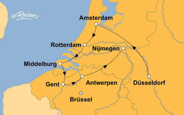 Eine Reise auf den Flussläufen und Kanälen Hollands und Belgiens ist Erholung pur: schieben sich die Wasserstraßen durch die weiten grünen Wiesen, vorbei an grasenden Kühen, blitzsauberen Gehöften und an den typischen Windmühlen. Besonders im Frühling gilt dabei ein Ausflug zum Keukenhof mit seinem Blütenmeer als ein „Muss“ und Sie sehen den berühmten Blumenkorso. Nicht umsonst wird der Blumenkorso der Blumenzwiebelregion das Gesicht des Frühlings genannt, denn kein anderer Korso kann es mit den einzigartigen Frühlingsfarben und -düften aufnehmen, die ihn umgeben. Sie haben die Qual der Wahl. Auf alle Fälle Blumen!